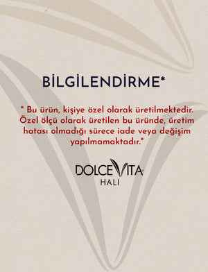 Not: Bu halı doğal elyaf ve pamuk atkı ile üretildiği için eninde ±%3–4, boyunda ise ±%1–2 oranında çekme payı olabilir.